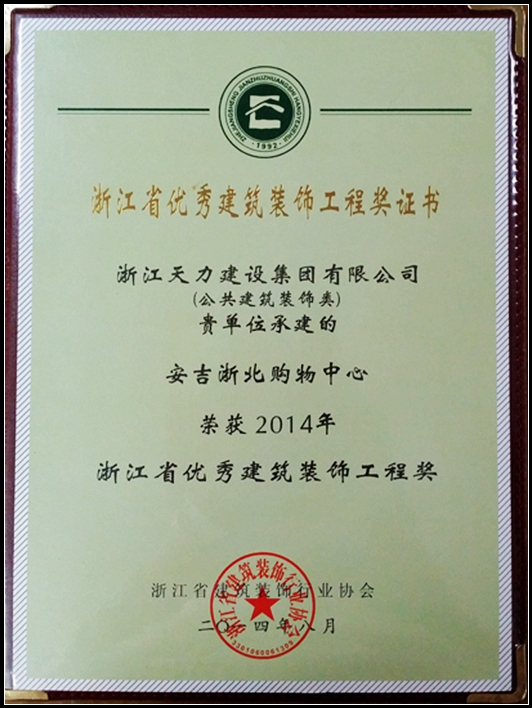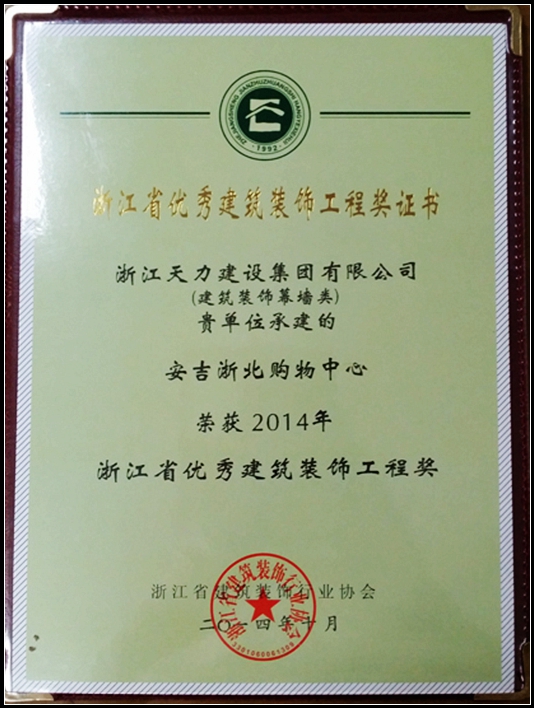 安吉浙北購物中心(建筑裝飾幕墻類)、(公共建筑裝飾類)榮獲2014年浙江省優秀建筑裝飾工程獎