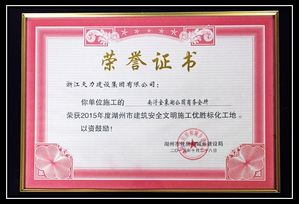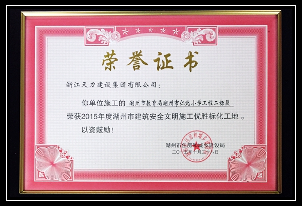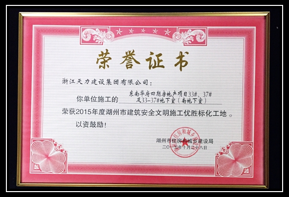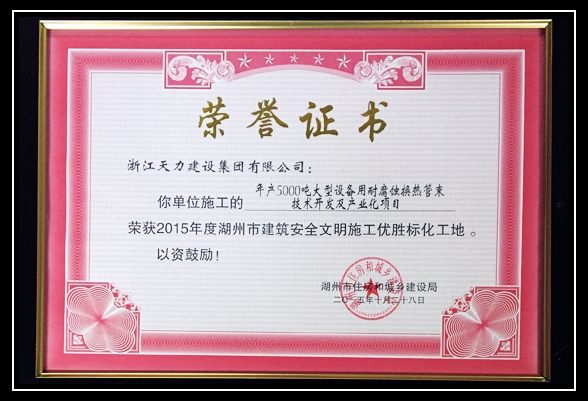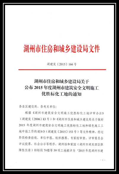 2015年度湖州市建筑安全文明優勝標化工地-湖州市教育局湖州市仁北小學工程二標段、年產5000噸大型設備用耐腐蝕換熱管束技術開發及產業化項目、南潯金象湖公園商務會所、東南華府四期房地產項目