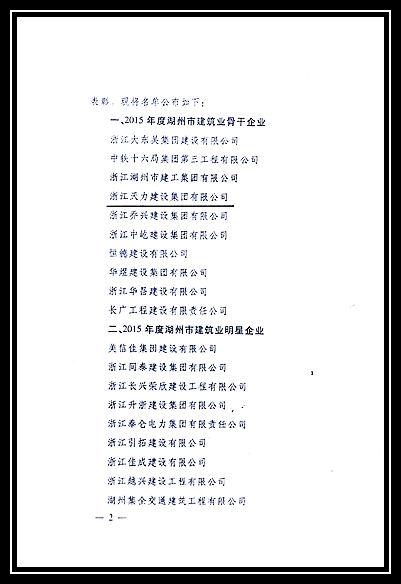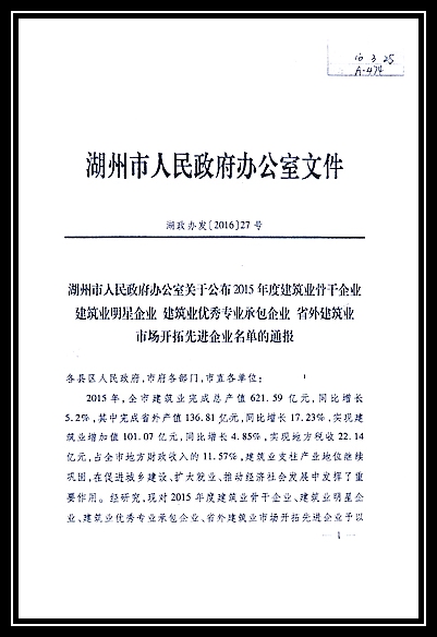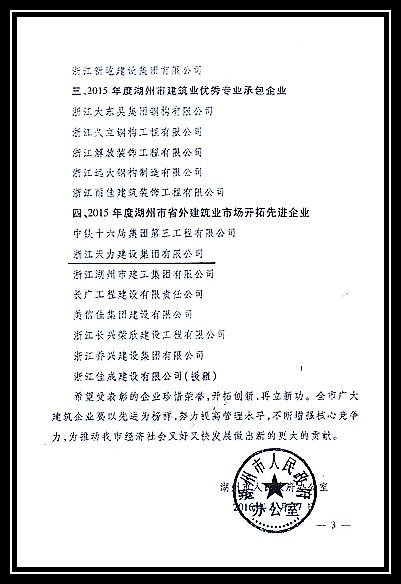 2015年度湖州市建筑業(yè)骨干企業(yè)、湖州市省外建筑業(yè)市場開拓先進(jìn)企業(yè)