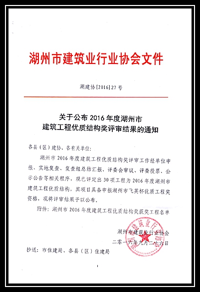 2016年度湖州市建筑工程優質結構獎評審結果的通知