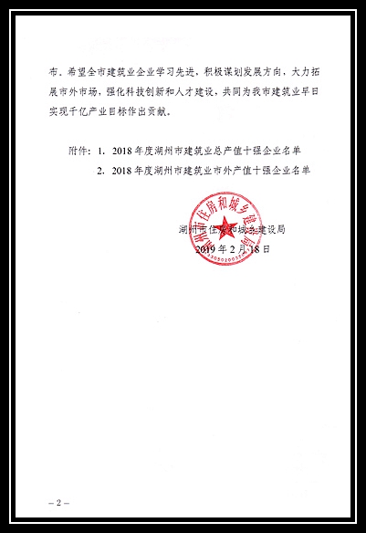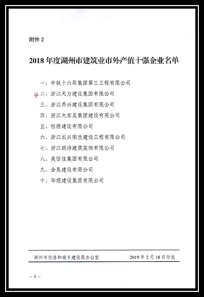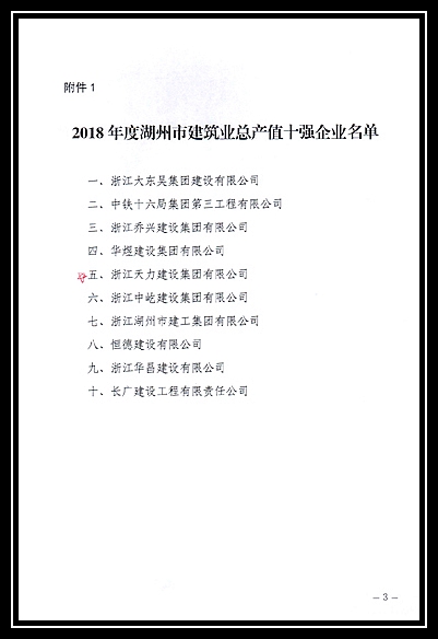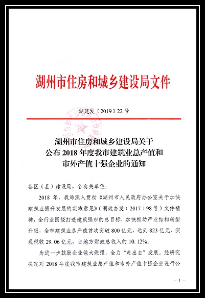 2018年度湖州市建筑業總產值和市外產值十強企業