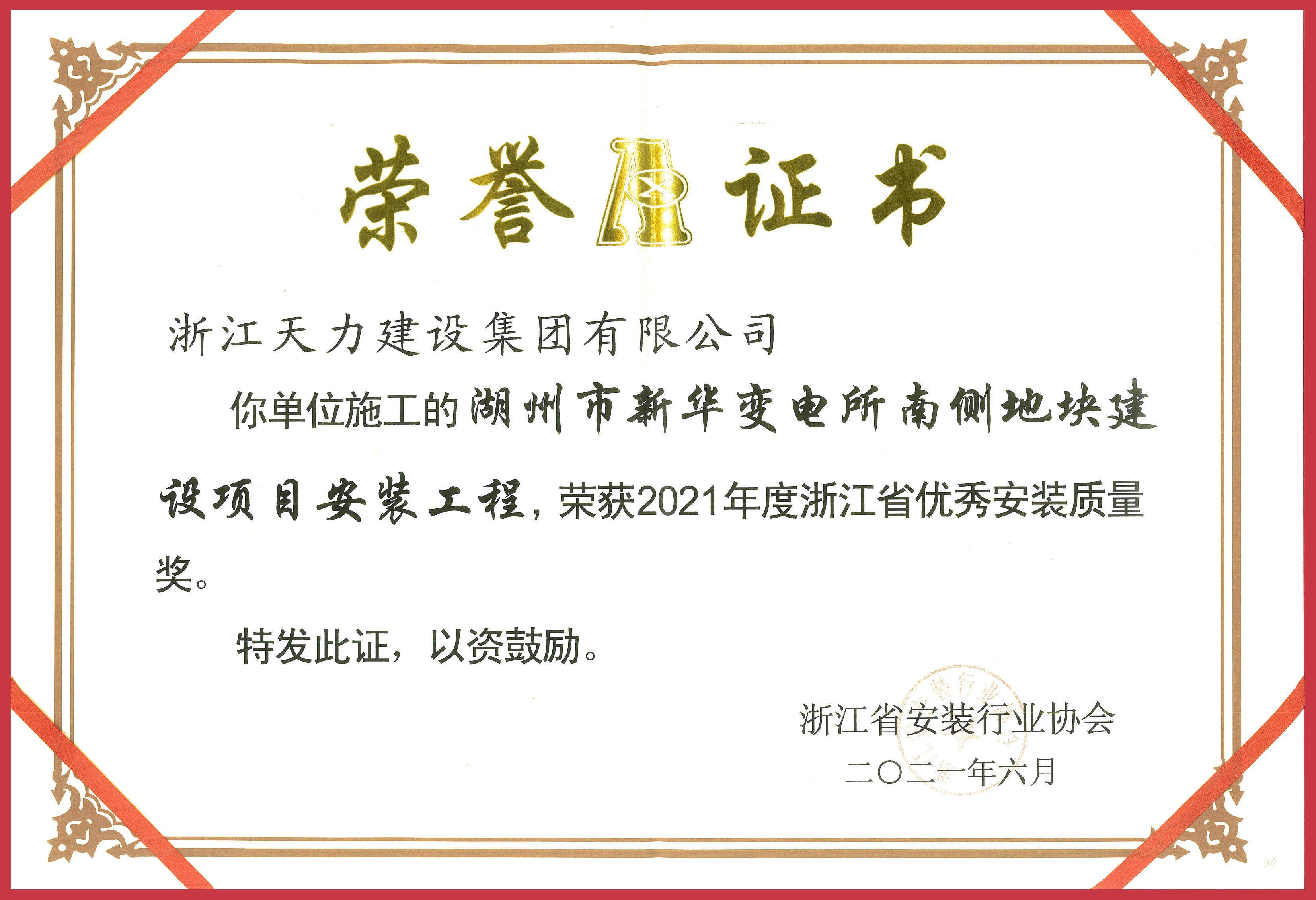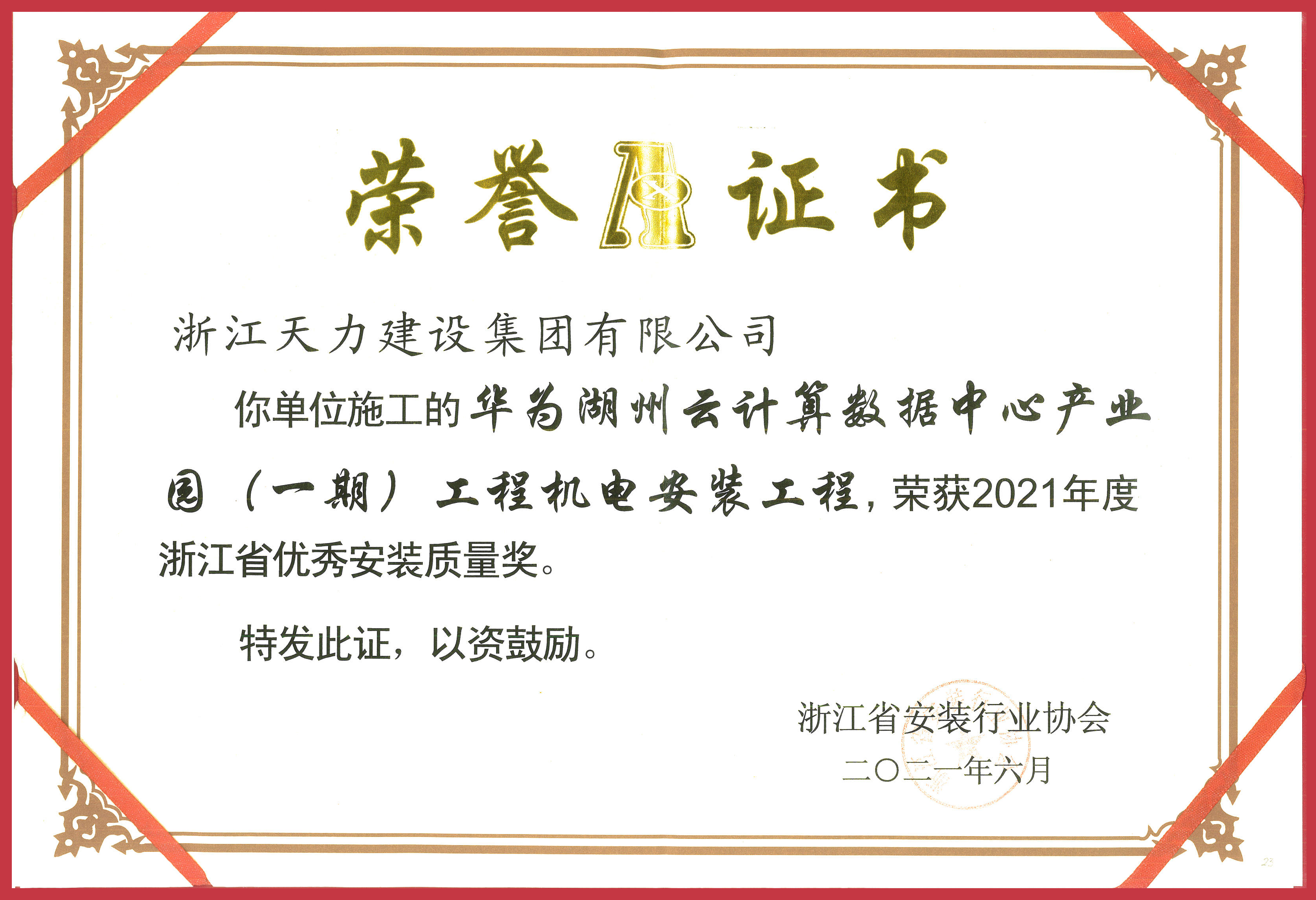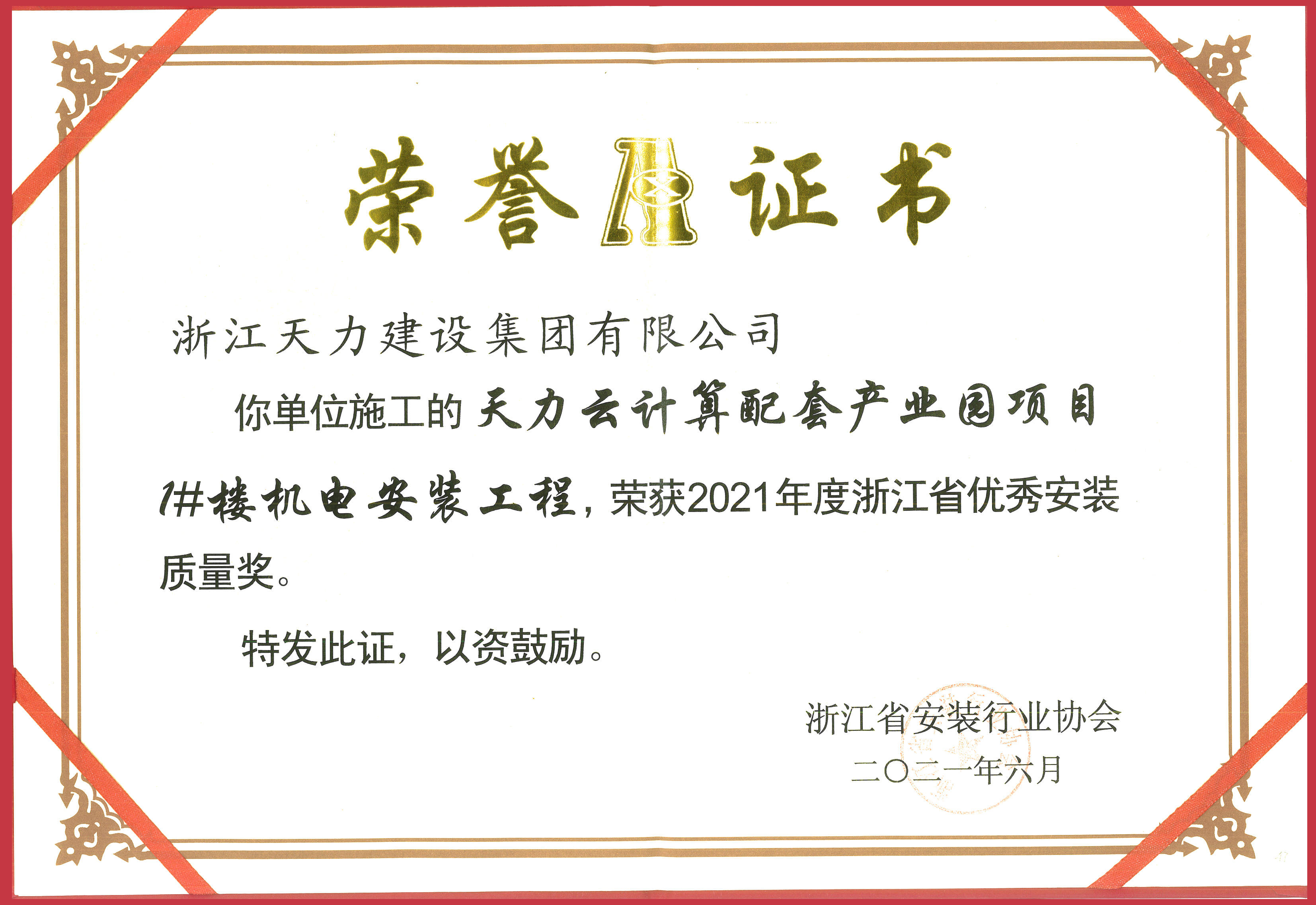 2021年度浙江省優(yōu)秀安裝質(zhì)量獎