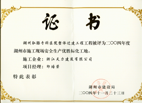湖州肛腸專科醫(yī)院整體遷建2004年度湖州市優(yōu)勝標(biāo)化