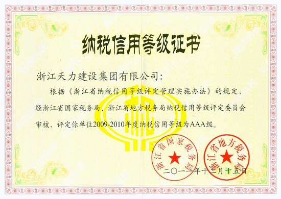 公司榮獲2009-2010年度納稅信用等級AAA級