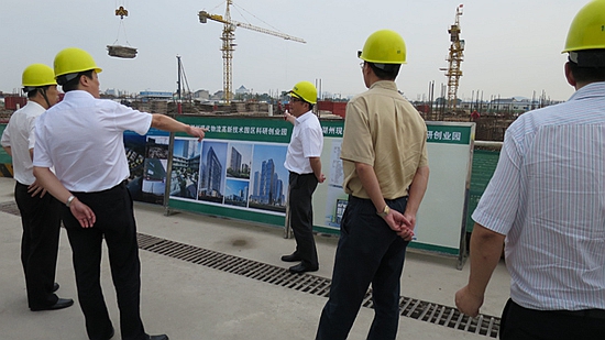 2014年9月29日上午,湖州市人大主任朱坤民、常務副市長楊建新、區委書記蔡旭昶、吳興區常務副區長周建新、區人大常委會主任吳旭等有關部門負責人和公司董事局主席楊虎麟、副總經理印培榮的陪同下,視察了我公司承建的高新區現代物流創業中心,就抓好建筑工地揚塵管理、建筑垃圾清理,推進大氣霧霾治理進行專題調研。